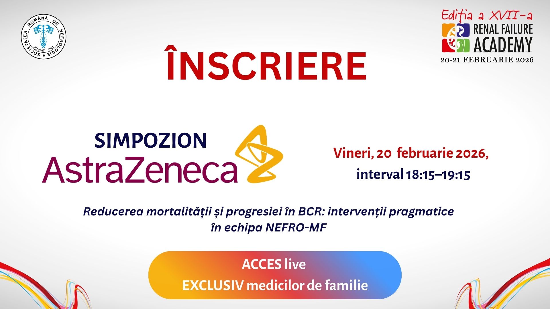 Vă invităm cu drag să vă înscrieți gratuit pentru a participa online la simpozionul organizat de către compania AstraZeneca în cadrul Conferinței Renal Failure Academy, transmis LIVE pe platforma SRN.